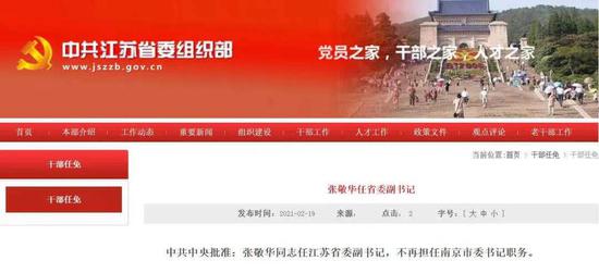 中共中央批准:张敬华同志任江苏省委副书记,不再担任南京市委书记职务。