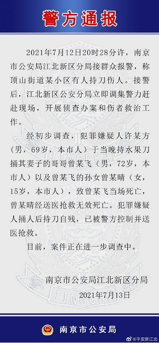 7月13日,据警方通报,南京一男子持刀捅人致2死,其中一位被害人仅15岁。