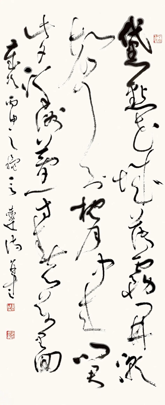 一是独特的用笔方法。我们知道书法最大的核心之一是用笔,笔法决定了书法的专业程度、境界的高下,以及风格的形成,当然,用笔也受到外在如毛笔、纸张、书体以及理念的影响。我们看到言先生的书法所具有的独特书风,与其独特的用笔方法是分不开的,在以中锋为主的用笔基础上,中、侧锋互用,并伴随着裹锋、涩行的互用,以适应长锋羊毫和生宣纸等工具、材料的特性。这种用笔方法在其正书如甲骨文、篆书和隶书中使用,难度不算很大或不甚明显,但运用于行草书特别是大草的创作,既要保持线条的质量,又要保持中锋的任意挥写;既要克服纯羊毫特质,又要借助生宣纸的晕化,保持裹锋、涩行的用笔方法,并将这些矛盾一一化解难度却不小。因此,独特的用笔,使他的正书不滞不板,他的草书宁静而纯正,既高古又有新意,从古远的篆籀而来,又连接起羊毫和生宣的特性,是古典书法用笔的当代创新。