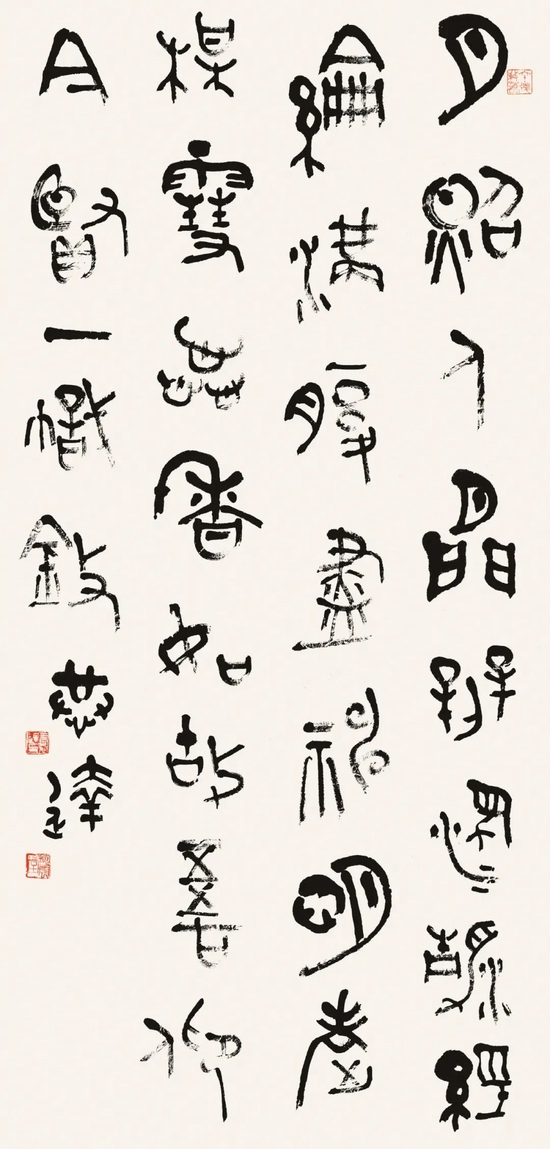 三是接续碑帖结合的创新之路。前面我们说过,中国书法、中国艺术是在自我文化系统中产生、发展、演化而来,有着稳定、自给的内在规律。“二王”帖派书法统治书坛1500年之后,到了明代末开始式微、衰败,于是碑学兴起。清代晚期随着碑学的矫枉过正,其局限性也日趋明显,有思想的书家开始走向变法,走向碑帖结合之路,并诞生了赵之谦、何绍基、吴昌硕、齐白石、黄宾虹和林散之等碑帖结合的书画大家。虽然这一创新之路受到百年来的社会动荡所干扰,但这股内在的书法演化创新之路始终存在,发挥着延续书法发展的重要作用,并决定了书法未来的发展方向。
