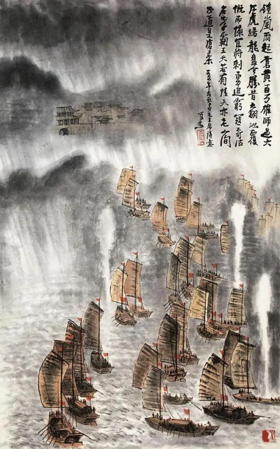 《百万雄师过大江》是李可染于新中国成立十五周年之际,以毛泽东所赋的《七律·人民解放军占领南京》为蓝本创作的革命历史题材画作。此作以渡江战役的场景入画,重在表现激荡磅礴的战役气氛。李可染擅用水墨渲染氛围,这一特点也在这幅画中得到了极致的体现。