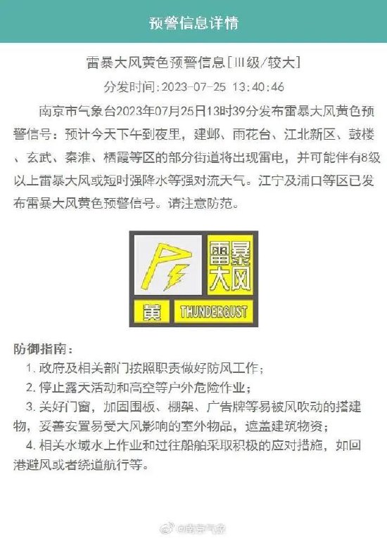 7月25日13时39分,南京气象台发布雷暴大风黄色预警信号:预计今天下午到夜里,建邺、雨花台、江北新区、鼓楼、玄武、秦淮、栖霞等区的部分街道将出现雷电,并可能伴有8级以上雷暴大风或短时强降水等强对流天气。江宁及浦口等区已发布雷暴大风黄色预警信号。请注意防范。