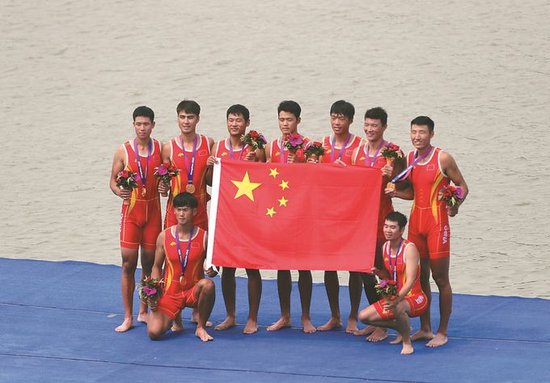 9月24日,在杭州亚运会赛艇男子八人单桨有舵手决赛中,来自淮安的运动员蔡鹏鹏(右四)与队友李文雷、陈弦峰、徐桥、吕毅、冀高星、倪旭林、聂毅德和梁伟雄获得该项目金牌。这是本届杭州亚运会江苏健儿夺得的首金。