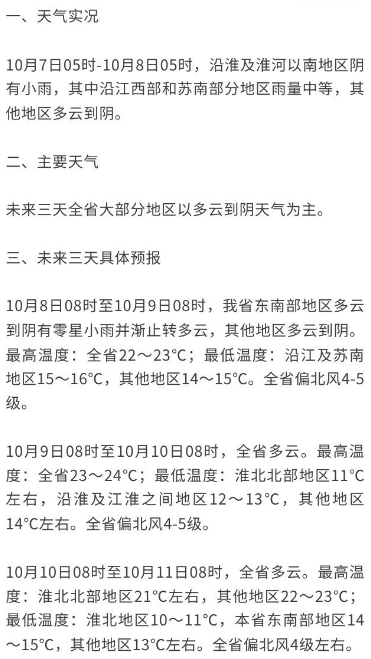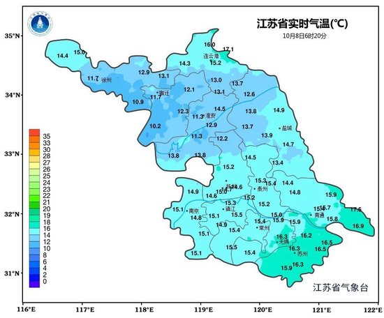 最低温度:沿江及苏南地区15~16℃,其他地区14~15℃。
