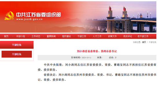 省委决定:刘小涛同志任苏州市委委员、常委、书记,曹路宝同志不再担任苏州市委书记、常委、委员职务。