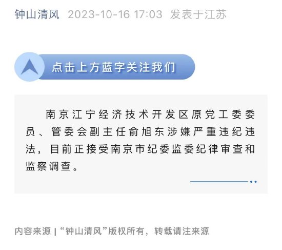 南京江宁经济技术开发区原党工委委员、管委会副主任俞旭东涉嫌严重违纪违法,目前正接受南京市纪委监委纪律审查和监察调查。(南京市纪委监委)
