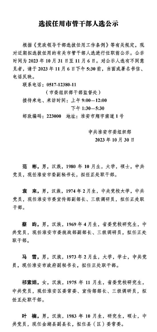 10月30日晚,淮安发布一则选拔任用市管干部人选公示。
