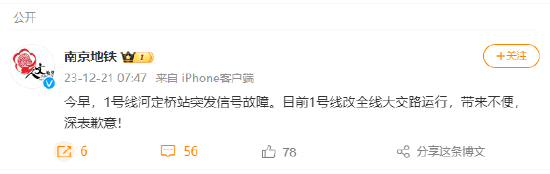 据@南京地铁,今早,1号线河定桥站突发信号故障。目前1号线改全线大交路运行,带来不便,深表歉意!