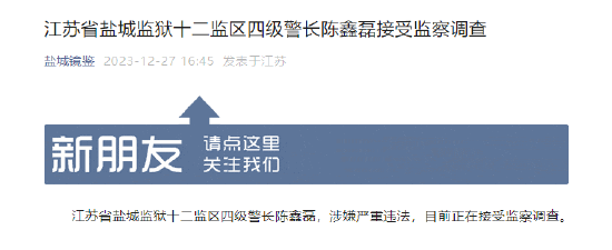 江苏省盐城监狱十二监区四级警长陈鑫磊,涉嫌严重违法,目前正在接受监察调查。