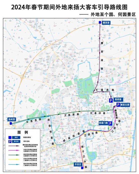扬州西收费站—文昌西路—润扬快速路—城南快速路—江阳东路—徐凝门路路内旅游大巴临时停车区