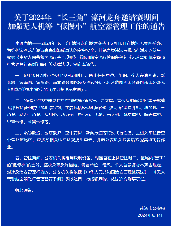 南通发布一则关于加强无人机等航空器管理工作的通告