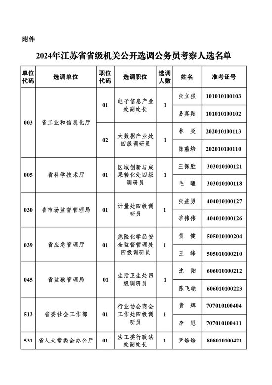 附件:2024年江苏省省级机关公开选调公务员考察人选名单