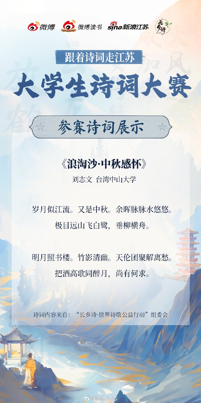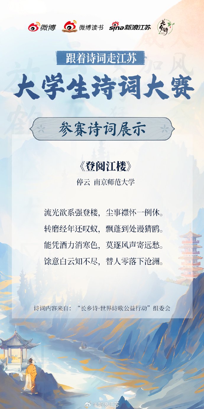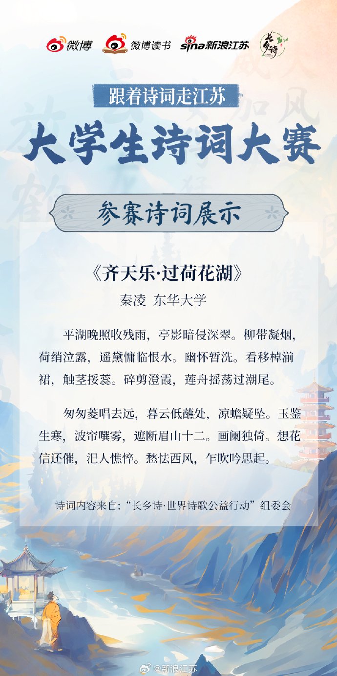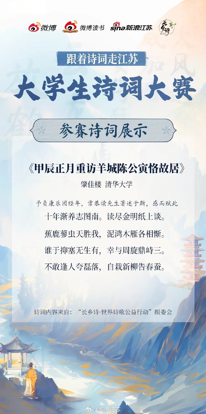 关注“跟着诗词走江苏”大学生诗词大赛自启动以来,陆续收到数百名大学生的作品,内容既有深度广度,又富有烟火气:少年诗赋最多情,笔端无限意,街巷卖花声。