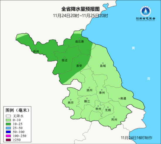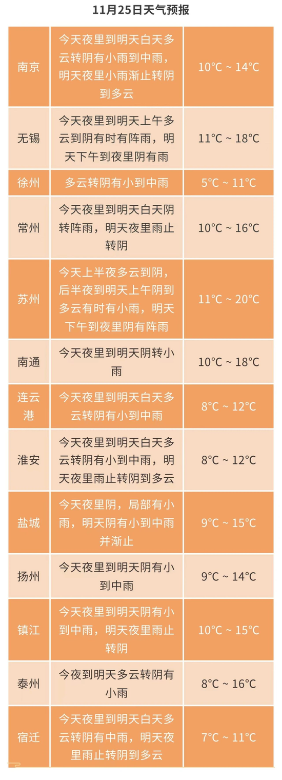 关注北方有一股较强冷空气正在东移南下,预计25日下午开始自西北向东南影响江苏省。受其影响,江苏全省大部分地区48小时最低气温将下降5~8℃,并伴有陆上5—7级,江河湖库7-8级,沿海海面8—11级的西北大风,过程最低气温将出现在27日或28日早晨:淮北地区-1~1℃,苏南南部地区3~4℃,其他地区2℃左右。