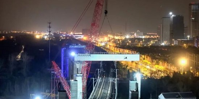 沪宁合高铁通泰扬特大桥起自南通,途经泰州,终至扬州,全长172.923公里,纵贯的江苏长江北岸地区属冲积平原地貌,横跨公路、铁路、水路,是沪宁合高铁全线控制性工程之一。其中,该大桥在扬州市境内,采用4个框架墩钢横梁形式上跨既有连镇高铁。当天吊装的首个钢横梁长35.28米、宽3.48米、高3.4米,重量达208吨,采用600吨履带吊车作业,吊装横跨通泰扬特大桥3755号墩左右幅,吊装后梁体底部距既有连镇高铁接触网最小距离只有1米,与连镇高铁成80度夹角。