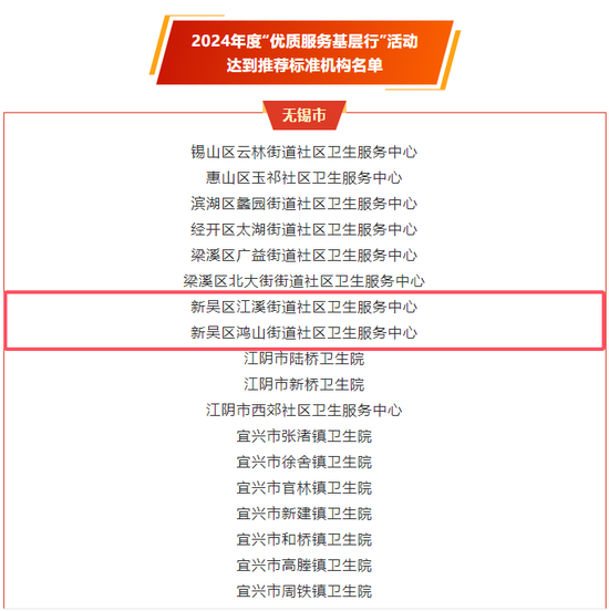 关注近期,国家卫生健康委员会办公厅、国家中医药管理局综合司发布《关于通报表扬2024年度“优质服务基层行”活动表现突出服务优质机构的通知》,新吴区江溪街道社区卫生服务中心、鸿山街道社区卫生服务中心2家单位榜上有名。截至目前,新吴区7家社区卫生服务中心全部通过国家“优质服务基层行”推荐标准,率先在全市范围内实现国家“优质服务基层行”推荐标准全覆盖。