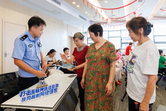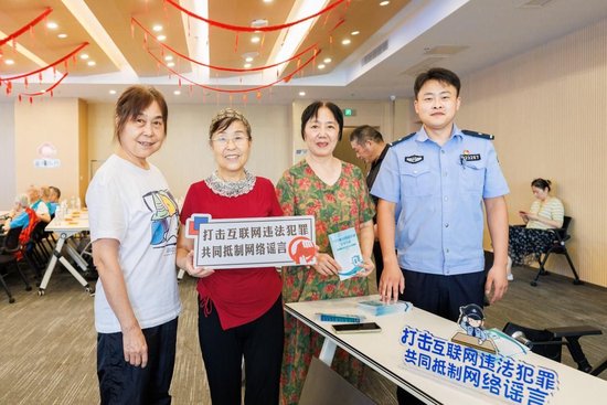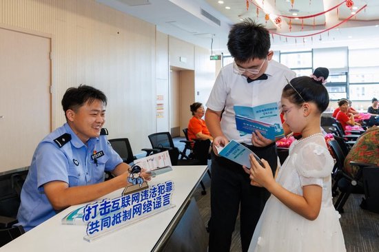 网安宣传摊位前,“一老一小”互动场景热烈鲜活,民警向老人、青少年儿童发放网安宣传手册,一对一解答“如何辨别虚假信息”,引导在“坚决举报恶意谣言,抵制虚假信息”标语牌前打卡倡议,鼓励成为“清朗网络小卫士”;老少围站桌边交流网络见闻、分享防护心得,让“打击网络违法、抵制有害信息”的共识具象化落地。