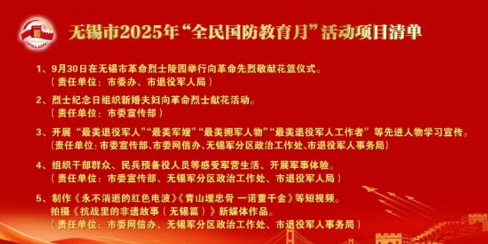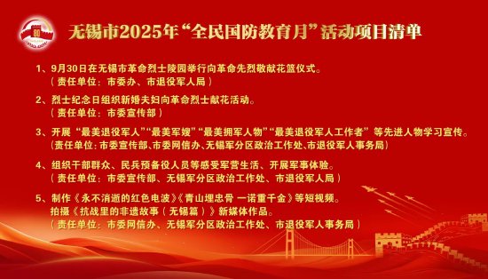活动在暖场片《国防有我》中拉开帷幕。现场,无锡市2025年“全民国防教育月”活动重点任务清单发布。“这些项目既是我们传承红色基因的‘任务书’,更是全市人民万众一心筑牢国防的‘责任状’。”市委宣传部相关负责人说,今年将通过祭扫先烈、红色宣讲、国防研学等10项活动,融合线上线下、军民互动等方式,让国防教育真正走进街头巷尾、融入千家万户。