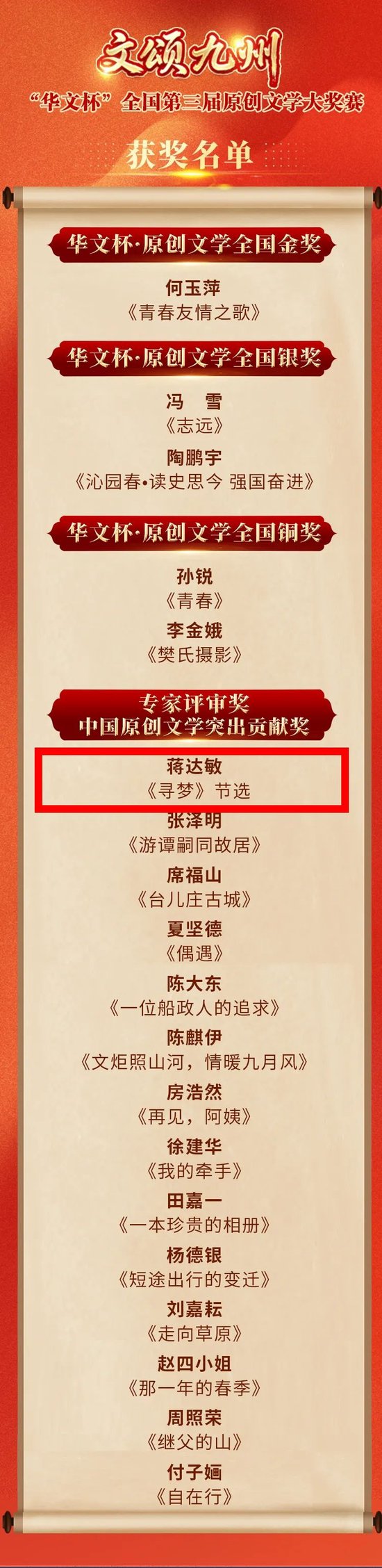 关注近日,文颂九州·第三届华文杯全国原创文学大奖赛落下帷幕。无锡作家蒋达敏获专家评审奖、中国原创文学突出贡献奖。