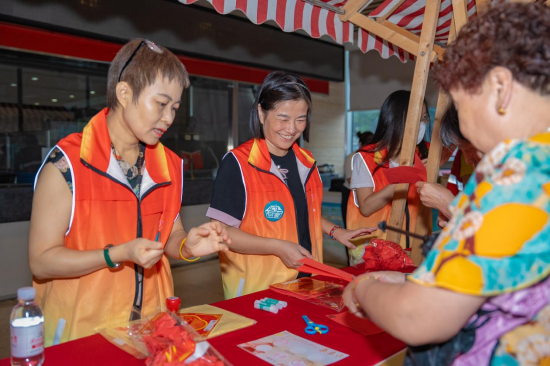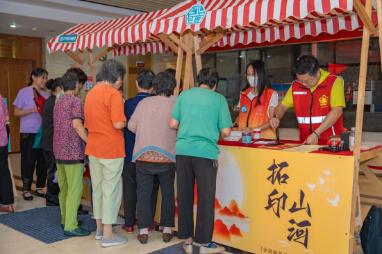 在“拓印山河”区域,非遗传承人谈闻安亲临指导,老人们专注地将双节元素拓印在纸上,通过指尖的力量,把对节日的美好愿景融入画中。在“剪影华章”区域,传来一阵“沙沙”的剪纸声,在志愿者的帮助下,长者们手执红纸,细心地剪出月亮、国旗等图案,传递对家国的情怀。