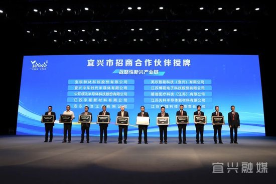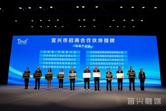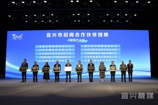 宜兴市招商合作伙伴授牌。10名优势产业链招商伙伴、10名战新产业链招商伙伴、10名未来产业链招商伙伴以及10名基金招商合作伙伴现场授牌,未来他们将继续鼎力支持宜兴招商引资、对外发展,助力宜兴的创新生态持续焕发生机、产业集群加速集聚成势。