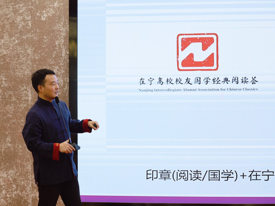南京大学南京校友会悦读俱乐部主理人宋海涛,作为发起人与筹备组组长,在成立大会现场详细回顾了国学经典阅读荟的筹建历程。