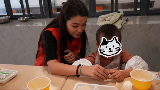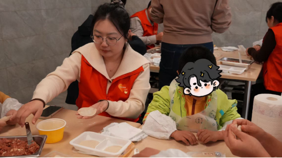 有的小朋友初次尝试时,馅料总是不听话地从饺子皮里“跑出来”,志愿者们便耐心帮着补捏;有的小朋友手部协调能力较弱,志愿者就握着他们的小手一起完成操作。活动室里充满了欢声笑语,孩子们从一开始的拘谨逐渐变得活跃,纷纷展示着自己包的“创意饺子”——有的像小元宝,有的形状不规则却充满童趣,每一个饺子都承载着孩子们的快乐与志愿者的关爱。