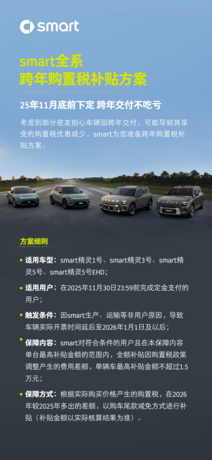 首批车主已交付,smart #5 EHD超级电混仍在火热销售中,诚邀到店体验,先享为快,解锁标杆级豪华混动SUV体验。现在下订,享16.99万元起的限时到手价、至高7万元权益,更可享smart“跨年购置税补贴方案”。