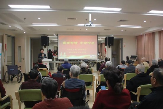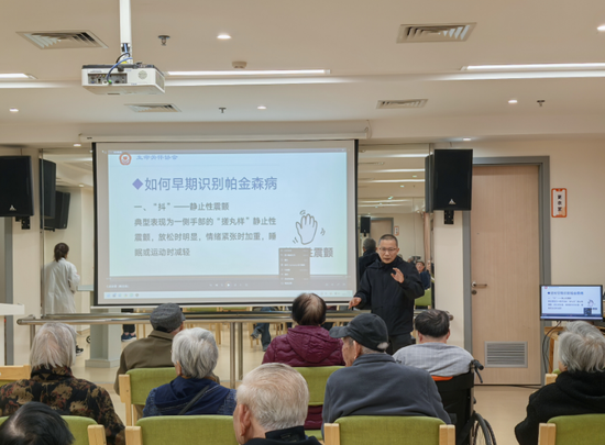 在活动室里,“三类老年慢性病”科普宣传与咨询活动正同步进行。江大附院神经内科专家桂树华主任,正以通俗易懂的方式,向老人和护工讲解老年抑郁症、阿尔茨海默症、帕金森病的早期识别、预防与护理知识。现场还发放了科普宣传资料,播放科普视频,帮助老人增强防治意识,做到早知晓、早预防、早治疗。老人们围着专家饶有兴趣地咨询、交流。