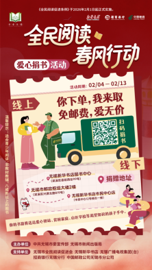 据悉,本次爱心捐书活动由无锡市委宣传部、无锡市新闻出版局主办,无锡市全民阅读促进会、无锡新华书店、无锡广播电视集团(台)、招商银行无锡分行、中国邮政公司无锡市分公司支持,活动持续至2月13日,重点募集适合青少年阅读、非教材教辅类且八成新以上的图书。募集的书籍将送达贫困家庭子女、孤残儿童、山区孩子等青少年群体手中,以书籍为纽带,传递城市关怀与温度。