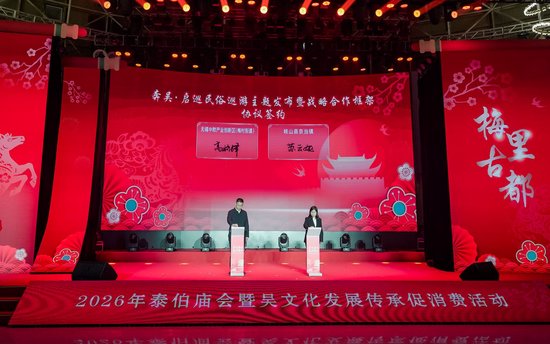 在本次活动上,2026年泰伯庙会民俗巡游核心主题“奔吴”正式发布,寓意着跨越千年的文明接力与文化传承从未止息。为深化文脉联动,加强源头与传承地的交流,梅村街道与陕西省岐山县京当镇签订战略合作框架协议,未来将推动两地文化经贸交流与文旅产业深度融合发展。