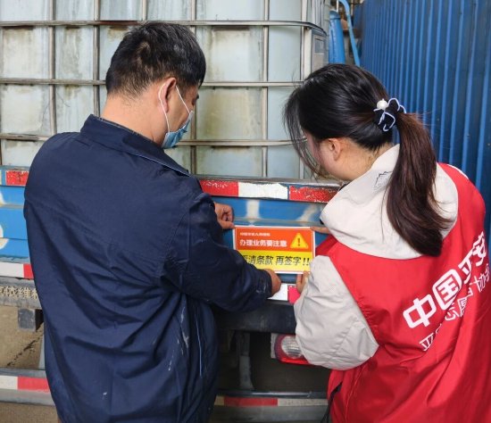 宣传员将印有防范金融乱象警示标语的贴纸贴在了一辆辆工厂的大货车上。随着一辆辆满载货物的大卡车驶出厂区、奔赴各地,这些醒目的防骗提示向货车司机提示金融乱象风险的同时,也随之穿梭于城市与乡村之间,成为流动的“消保宣传站”。