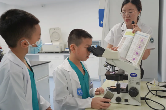 孩子们换上定制的“小医生”手术衣和白大褂,佩戴专属工号牌,在医院党史宣讲员的带领下,聆听生动的党史故事、学心肺复苏术(CPR)和“七步洗手法”、胸外按压、人工呼吸等,亲身体验到急救的紧迫与力量。来到手术室和科研实验室,观摩达芬奇机器人手术、观察实验设备、亲手操作显微镜等,感受到了前沿科技的魅力,点燃了孩子们对医学的无限好奇与探索欲。