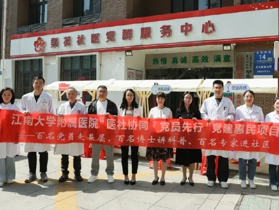 江南大学附属医院以“江南医先锋”党建品牌为引领,实施“医社协同 党员先行”党建惠民项目,开展“百名党员走基层、百名博士讲科普、百名专家进社区”专项行动。