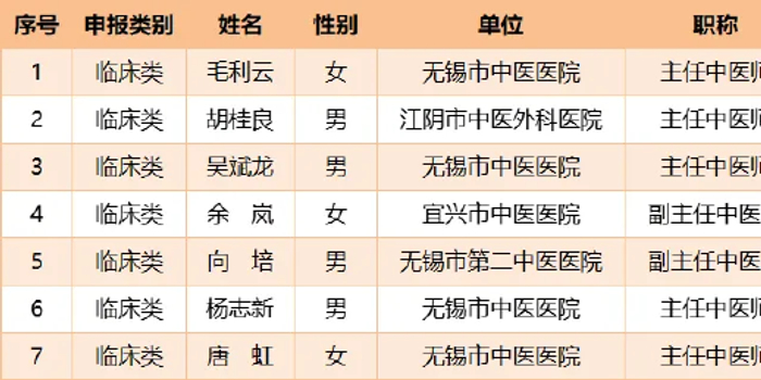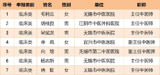 关注日前,国家中医药管理局公布第六批全国中医临床优秀人才研修项目培养对象名单(临床类),全国共有400人入选该名单,其中,江苏省入选41人,无锡卫生健康系统共有7人入选。